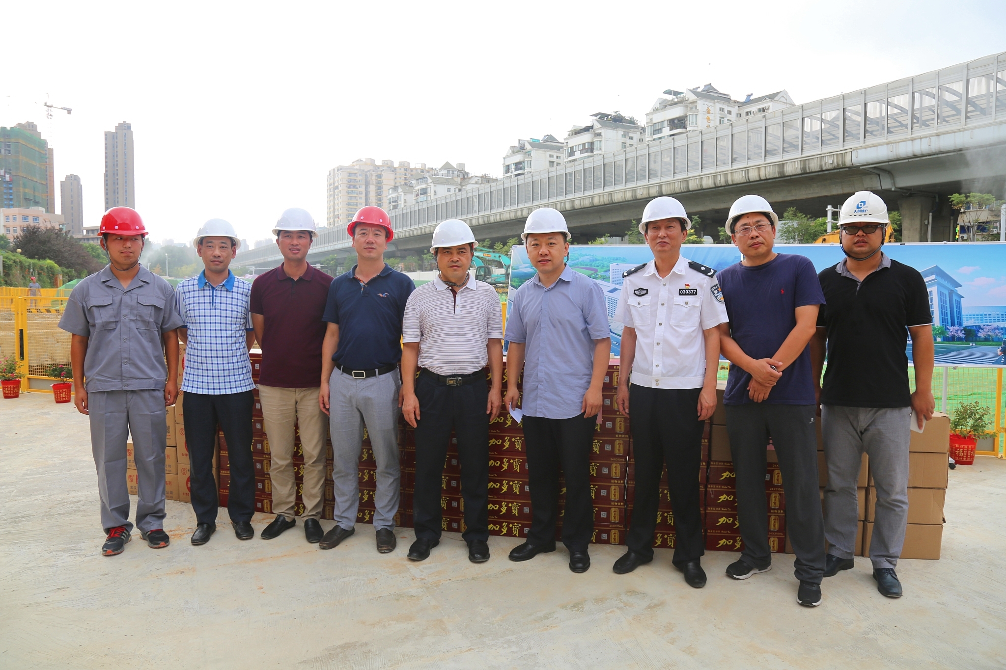 入伏以來,武漢持續高溫,近日來氣溫更是突破40度大關,7月31日下午,漢陽區委副書記閻磊、區委常委張才勝、副區長胡勇等一行冒著高溫走訪慰問了漢陽市政博宏公司在建工地,對在高溫下堅守建設崗位的基層施工人員表示關心和慰問,并送來了消暑降溫用品,漢陽市政黨委書記兼董事長嚴悌文、漢陽市政博宏公司總經理錢濤等陪同。